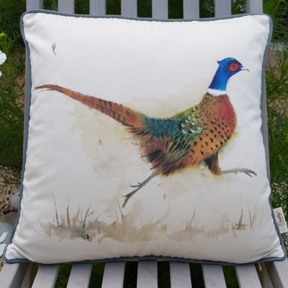 After searching the internet looking for a cushion with a single pheasant as the focal point, I decided to purchase this beautiful cushion from Sarah. Itis excellent quality, and is exactly as described. The colours are also as shown in the pictures. The back of the cushion is just as lovely, and the grey piping finishes it off nicely. Delivery was prompt. A statement piece for my new sofa.
